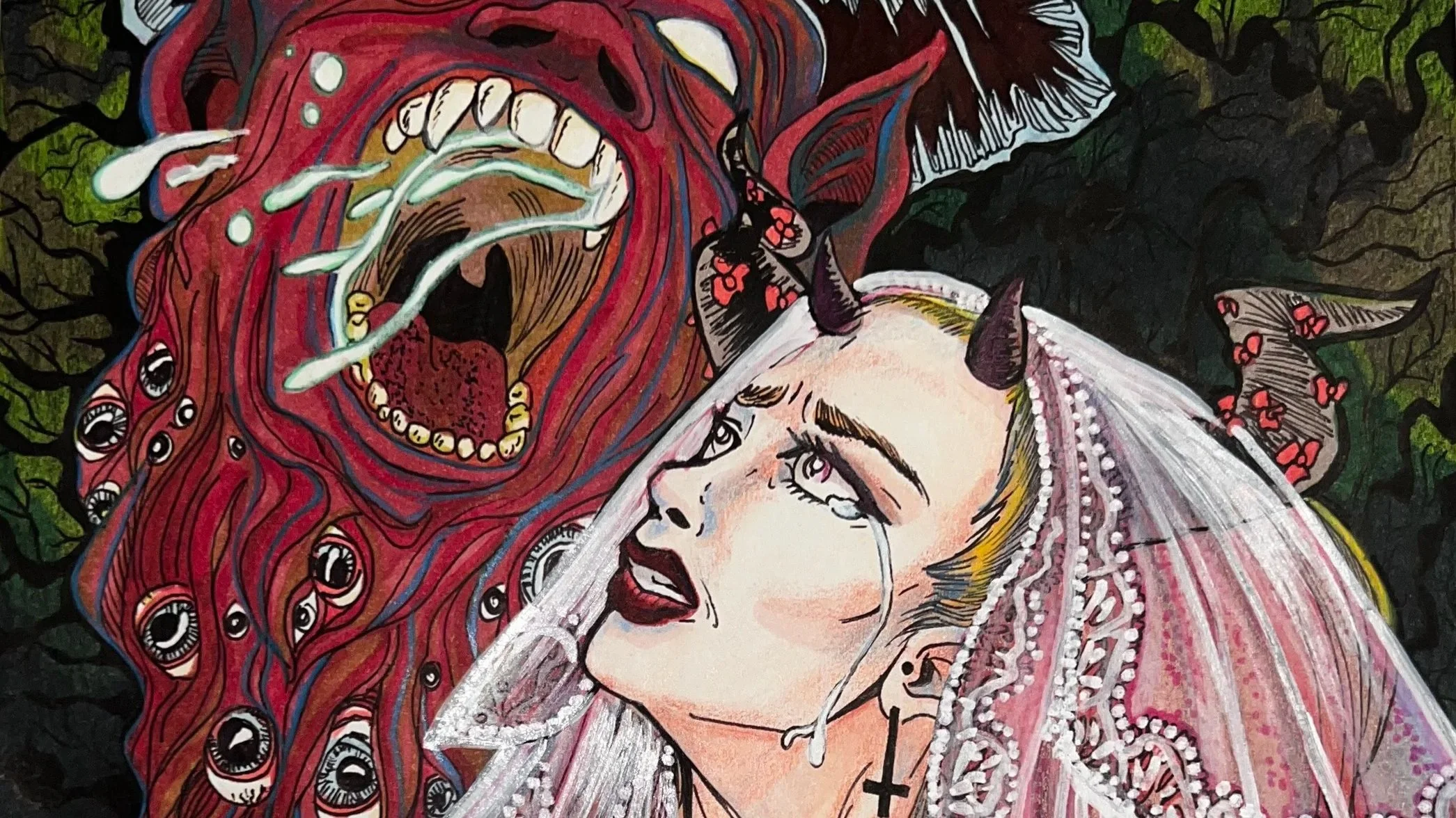 Illustration of bride with monster, mixed media on paper, 2022