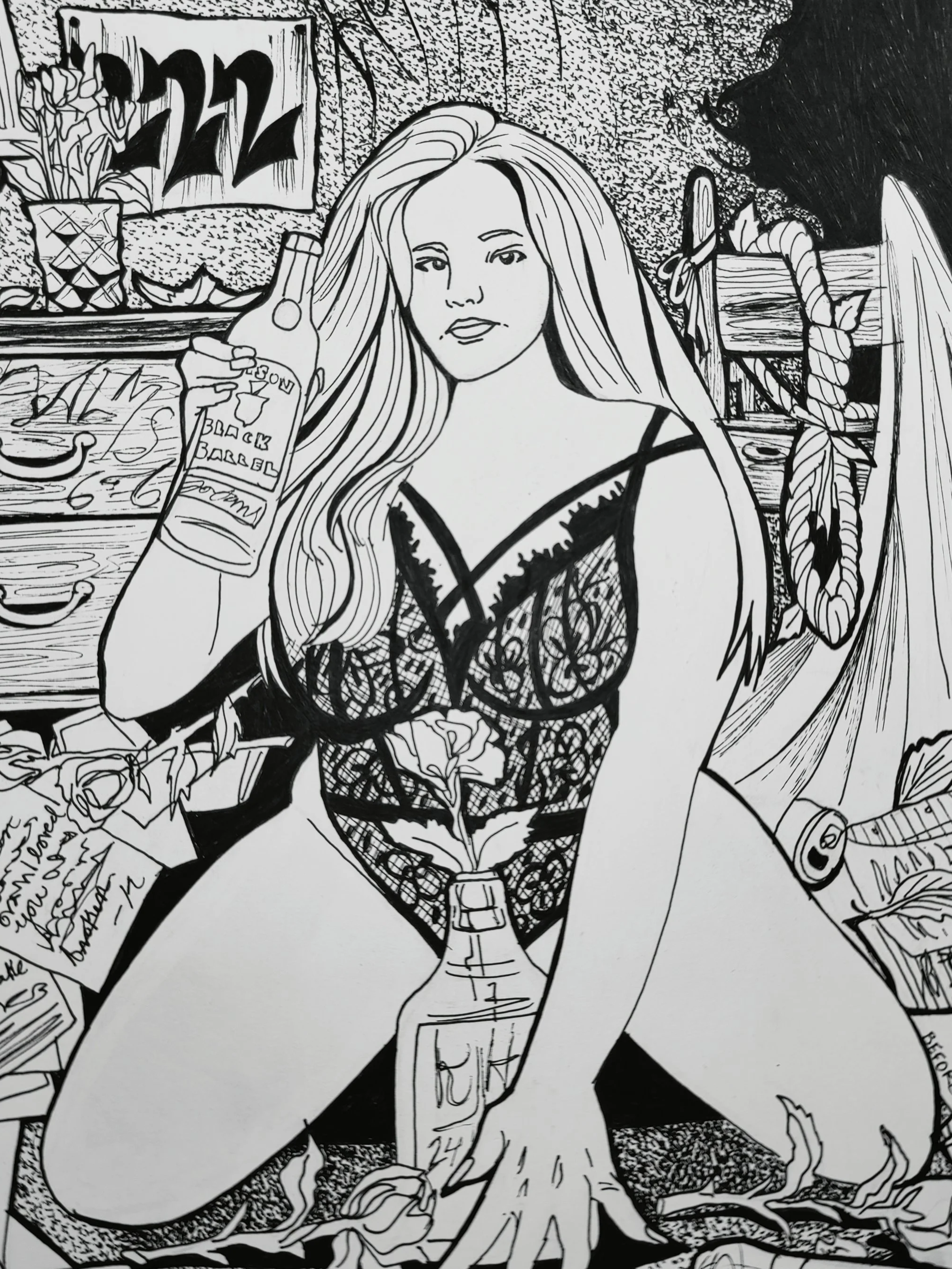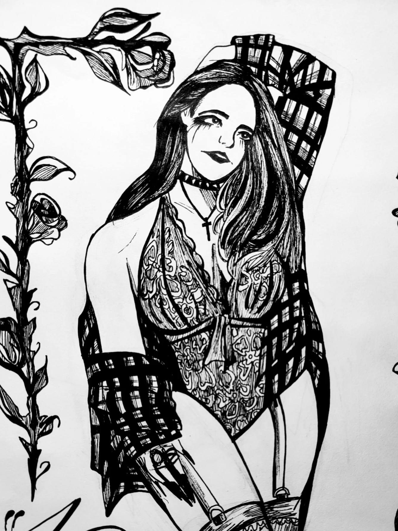 She is wearing a dress that is intended to subtly look like a wedding dress - a clue and reference to the title, and she doesn’t have the dark lipstick I typically draw her with, a possible nod to innocence.